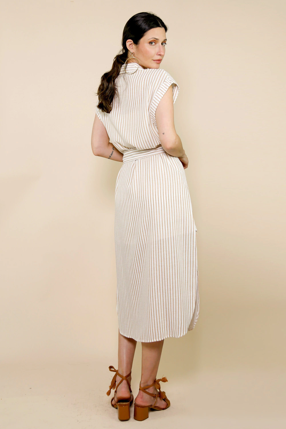 As fendas laterais e a faixa destacam a silhueta, enquanto o padrão listrado em tons khaki traz um charme irresistível. Perfeita para diversas ocasiões, essa peça se adapta ao seu estilo!